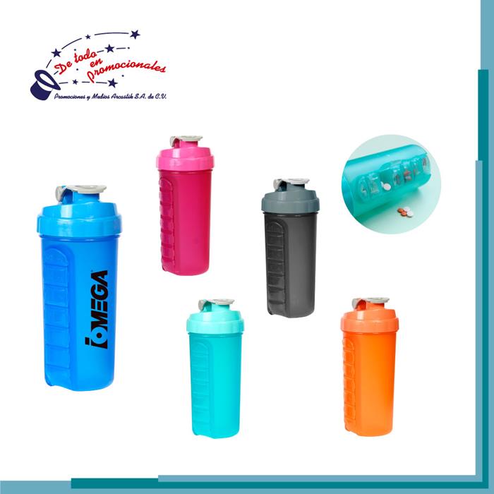 Cilindro en polipropileno (Shaker) con agitador de acero inoxidable, 2 compartimentos, pastillero y tapa de seguridad. Cuenta con medidas graduadas en mililitros y onzas. Capacidad 560 ml.