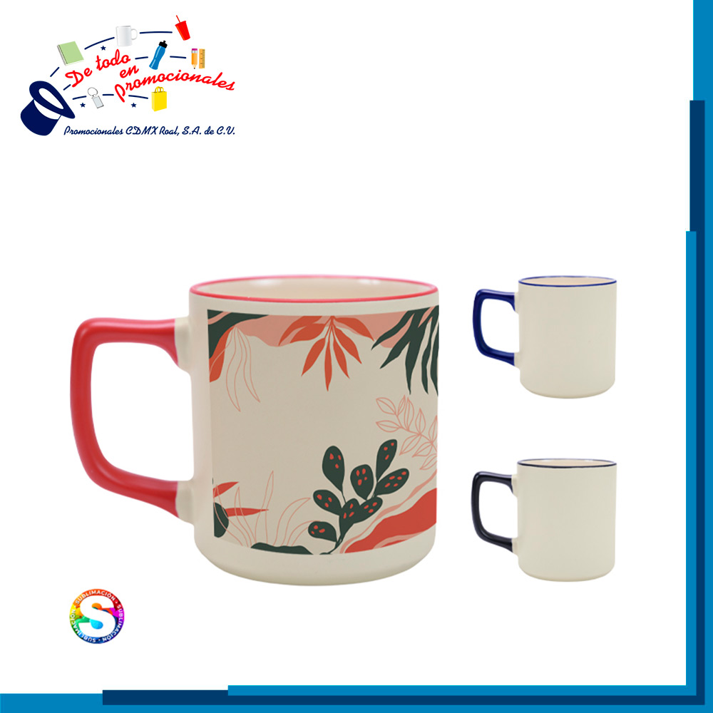 Tarro de cerámica de sublimación con asa y filo de color. CAP. 400 ml. (13.5 OZ). Venta en múltiplos de 12.