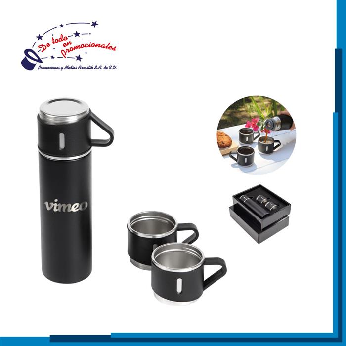 Termo de acero inoxidable en colores sólidos, con asa de plástico y tapa de rosca con seguro. Capacidad de 500 ml.