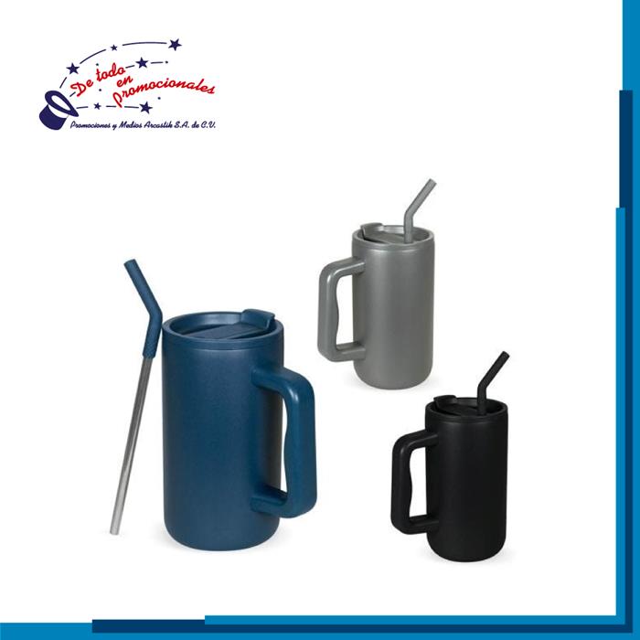 Termo de plástico de una pared. Tapa de plástico con sistema de rosca, sobre tapa con sistema de push y boquilla plegable con popote integrado. Su asa grande y ergonómica, permite un agarre más cómodo. Su combinación de colores, con un cuerpo oscuro translúcido y acentos en color sólido en el asa, popote y tapa. Capacidad de 1 Lt.