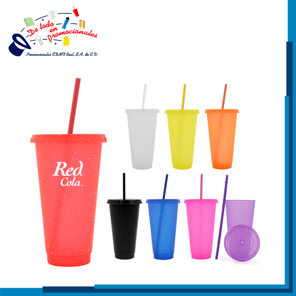 Vaso de plástico con glitter plateado, cuenta con tapa a presión de color y popote en el mismo color del vaso. CAP. 750 ml.