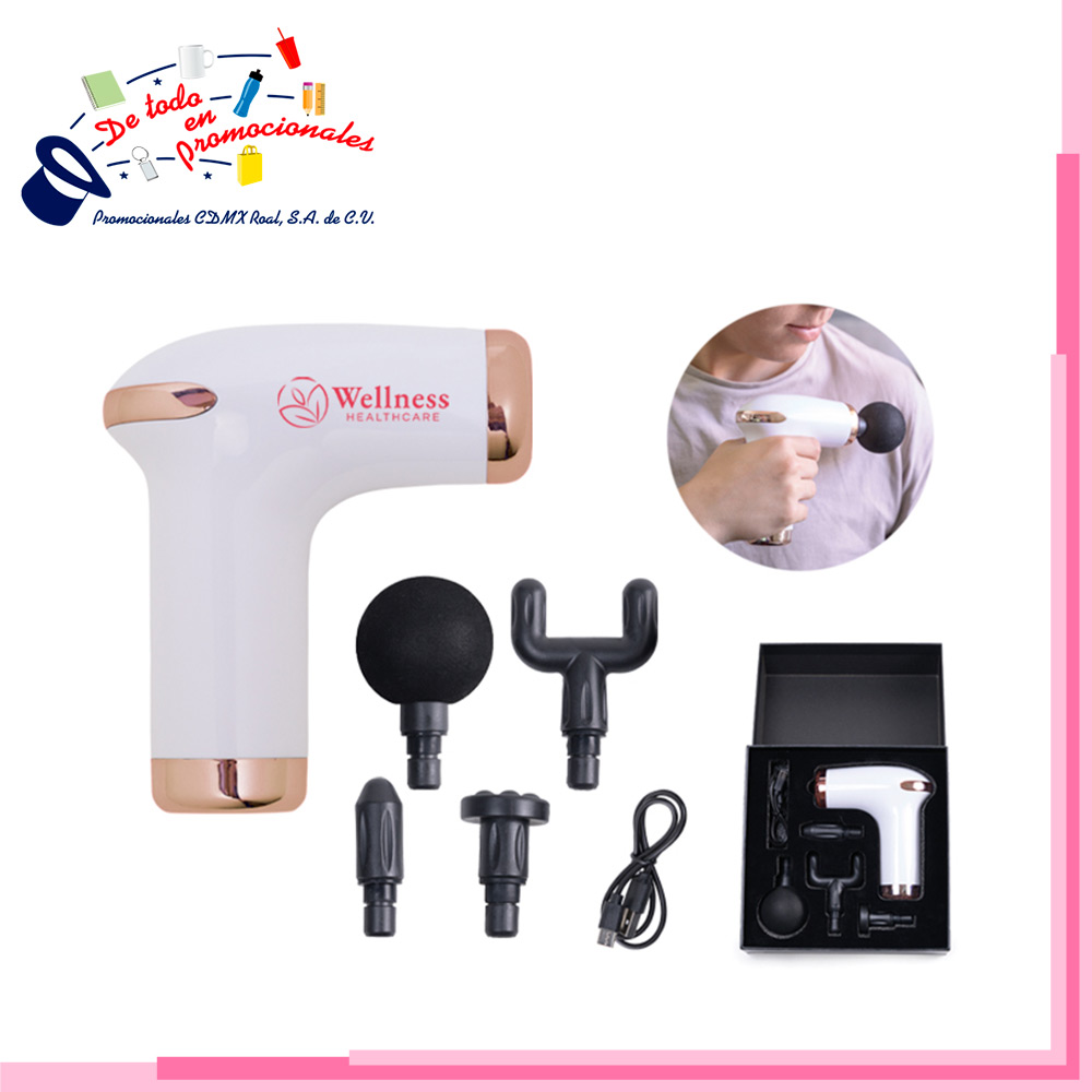 Pistola de masaje de vibración portátil con detalles en oro rosa, batería de 1200 mAh con 6 velocidades que incluye 4 accesorios: 1 cabezal en forma de U, 1 cabezal de bola, 1 cabezal plano y 1 cabezal cónico. Cuenta con entrada de carga Tipo C ( inlcuye cable). Tiempo de carga: 2 a 3 horas, Tiempo de uso 1 a 2 horas. Una vez al dejarlo encendido por largo tiempo se apaga automáticamente en 15 min. Presentación: Caja negra.