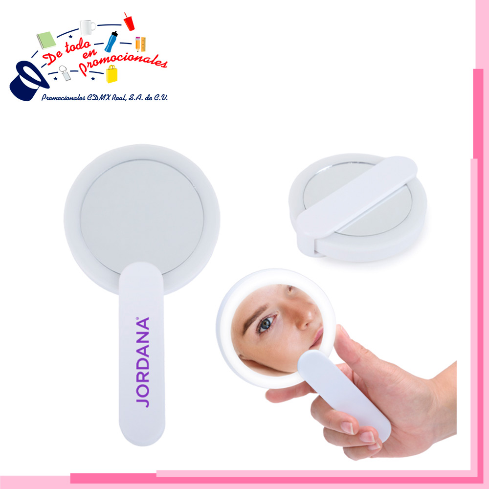 Espejo de bolsillo con 12 luces LED y mango giratorio que sirve como soporte. Tiene botón de encendido y apagado. Incluye 2 baterías de botón. Presentación: caja en color blanco.