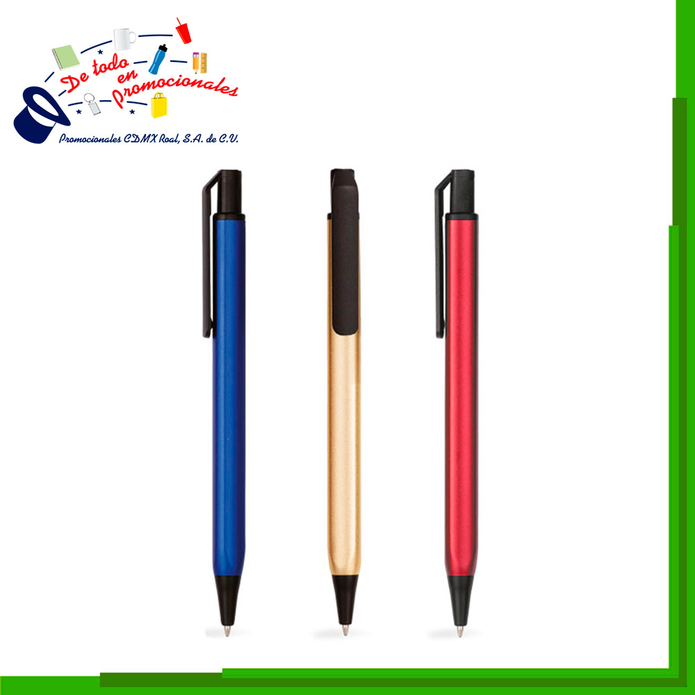 Bolígrafo metálico brillante, punta y clip de plástico en color negro. Diseño ergonómico de cuerpo triangular. Mecanismo de click.