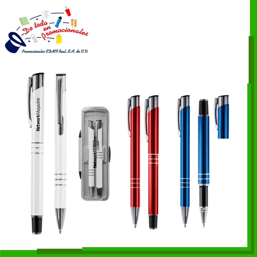 Set de bolígrafos metálicos de tinta negra. Un bolígrafo de punto fino tipo roller con tapa y un bolígrafo con mecanismo de click. Incluye estuche plástico de forro aterciopelado en color gris y tapa transparente para la impresión de logotipo.