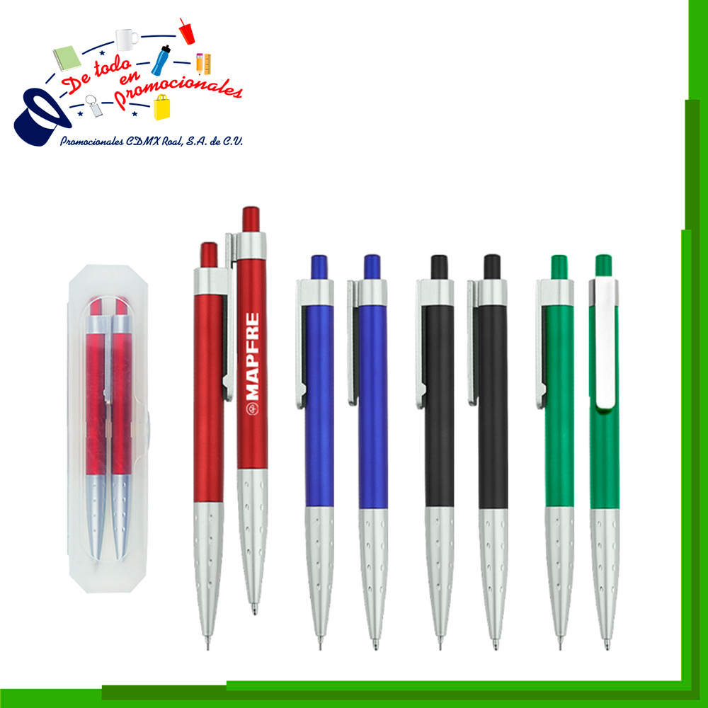 Juego de bolígrafo y lapicero de plástico con clip que se ensambla uno al otro para quedar perfectamente unidos. El clip y la parte inferior vienen en color plata, esta última con diseño de pequeñas hendiduras. Incluyen estuche traslúcido de plástico. Mecanismo de click.