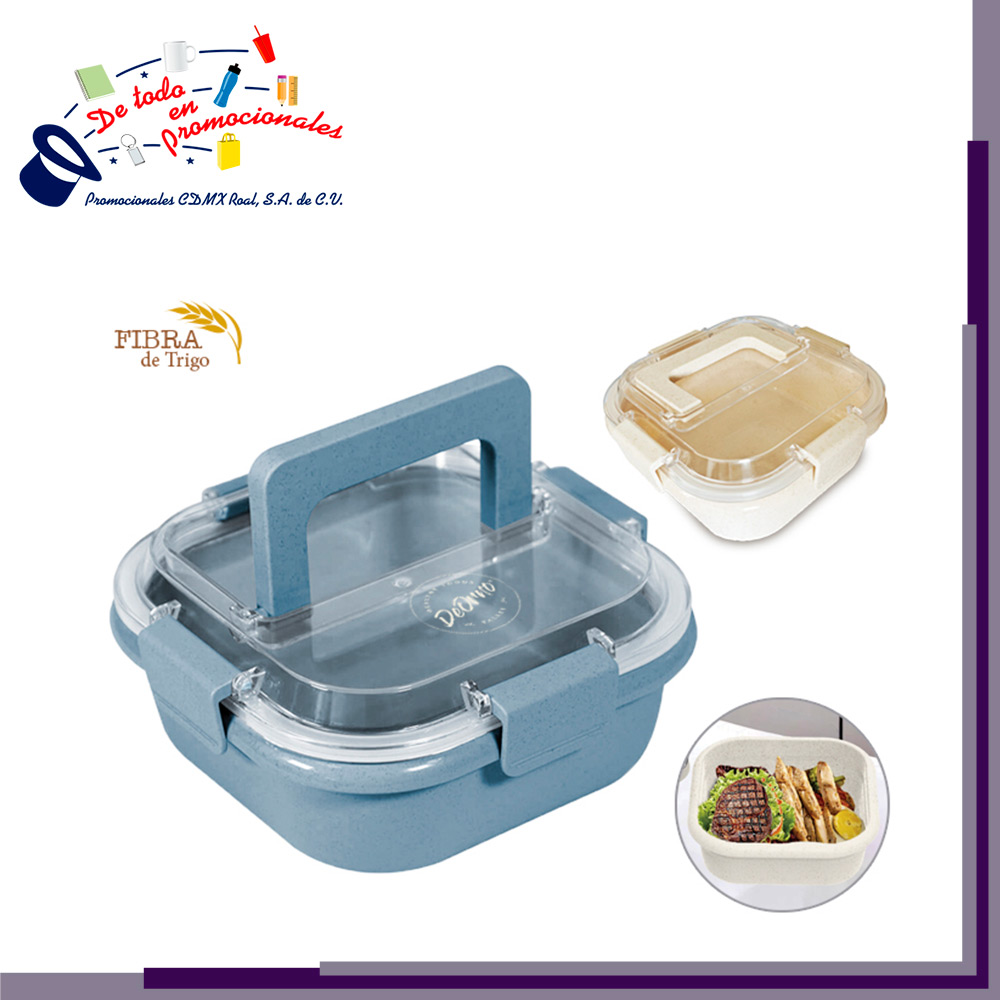 Box lunch de fibra de trigo con tapa hermética de plástico con broches de seguridad y asa.