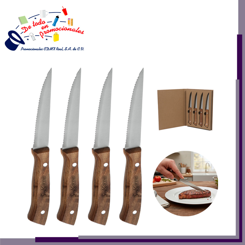 Set de 4 cuchillos de acero inoxidable para carne, con mango de madera de acacia. Presentación: caja individual.