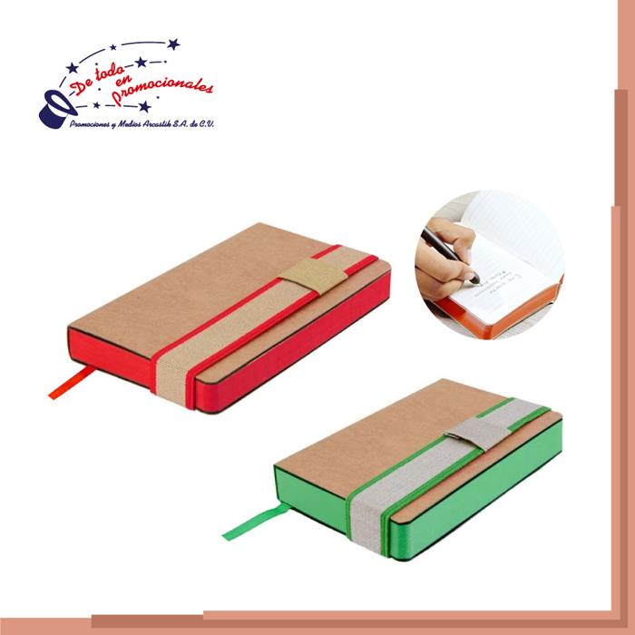 Libreta con 70 hojas de raya. Incluye 3 blocks de notas y banderillas adheribles de diferentes colores, bolígrafo ecológico, compartimento para tarjetas, sobre en contraportada y espiral metálico doble.