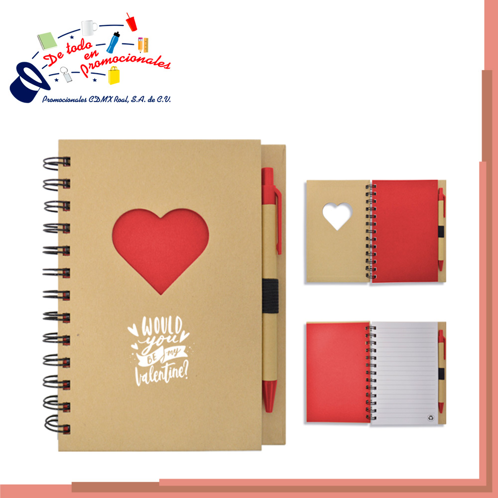 Libreta ecológica de cartón con espiral metálico, 70 hojas rayadas, cinta elástica porta bolígrafo y bolígrafo de catón. La portada cuenta con suaje en forma de corazón.