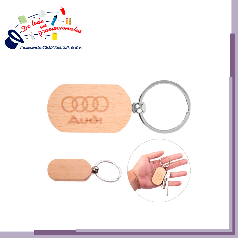 Llavero de madera con arillo metálico reforzado.