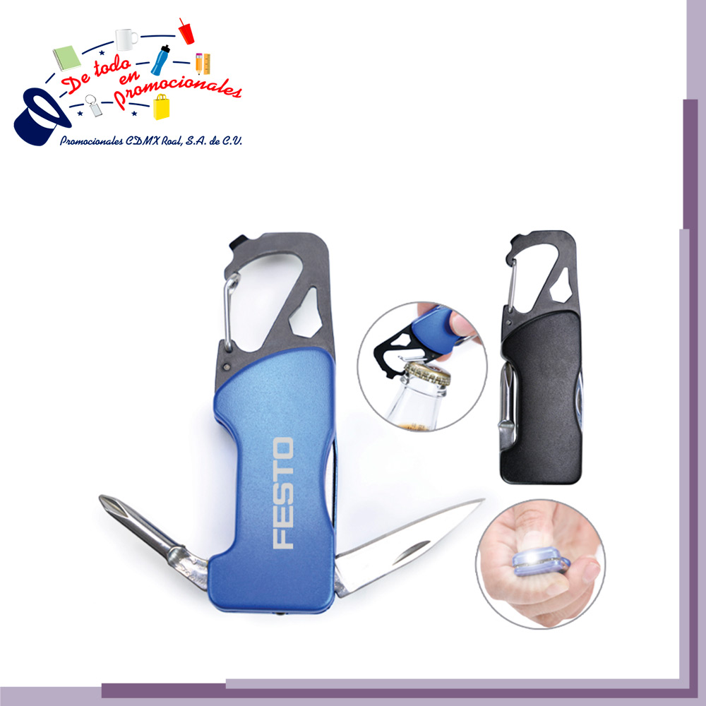 Gancho con clip multifunción que incluye: Luz LED con botón de encendido/apagado, navaja, destapador, llave allen, mini desarmador plano y desarmador de cruz. Incluye 2 baterías de botón. Presentación: caja individual de kraft.