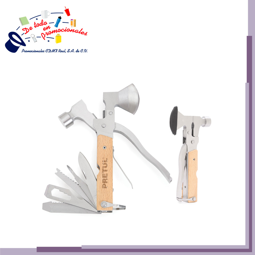Multi herramienta plegable tipo martillo con mango de madera y 14 funciones: Hacha, alicatas redondas, alicatas planas, martillo, navaja de sierra con lima, desarmador plano pequeño, destapador de botellas, llave múltiple, desarmador plano grande, descamador de pescado, desarmador de cruz, navaja, cortador de alambre y arillo para colgar. Presentación: caja de regalo a color.