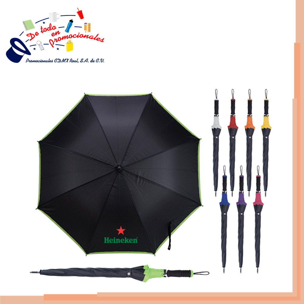 Paraguas de 8 gajos con botón de apertura automático, varillas y eje de fibra de vidrio. Cuenta con cintillo para guardar, orilla de color en los gajos, mango EVA con punta de color y cordón para transportar.
