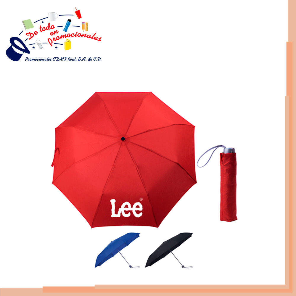 Paraguas de bolsillo antiviento con apertura manual, varilla de fibra de vidrio y aluminio, eje de metal. Cuenta con mango plástico de color y correa de poliéster. 8 gajos. Incluye funda.