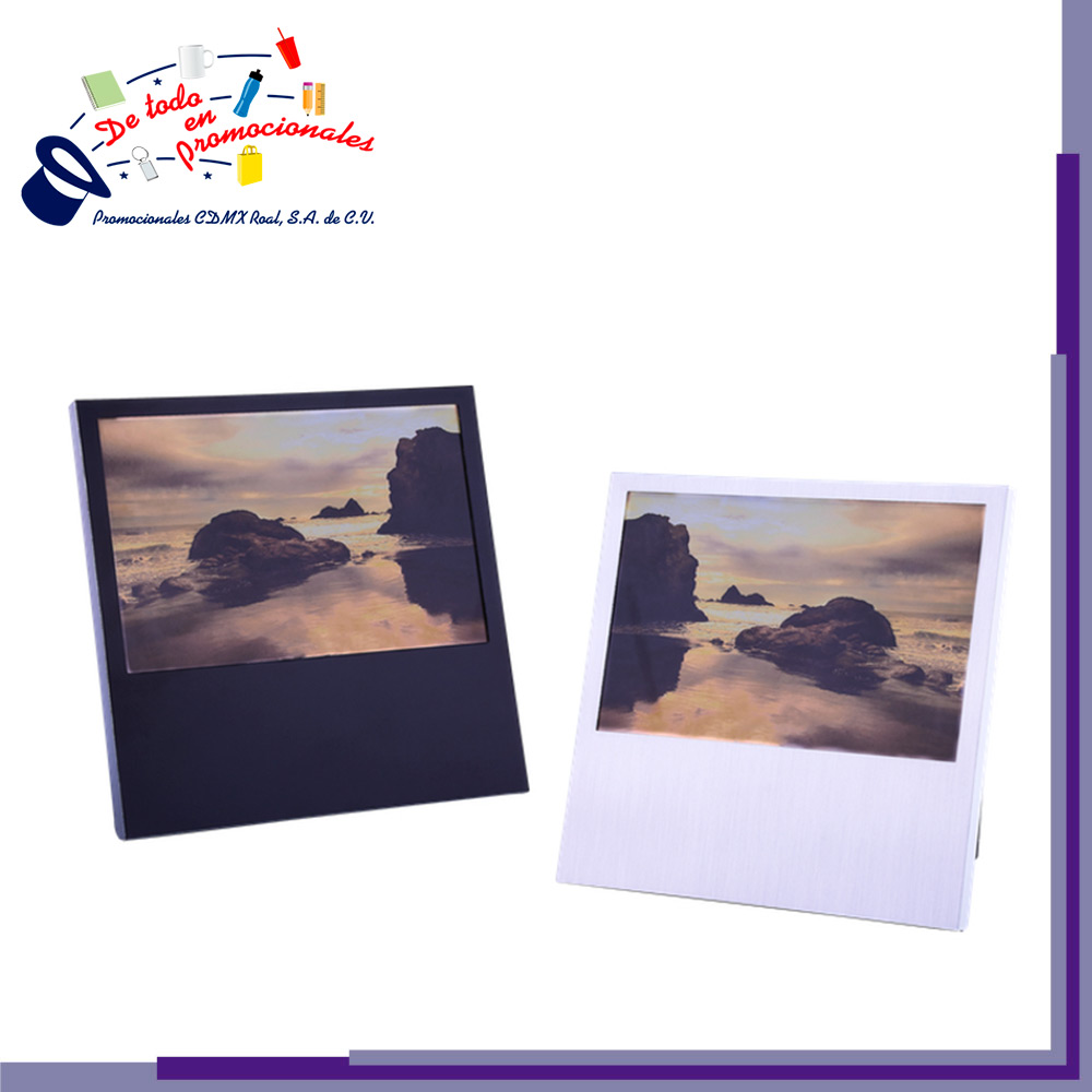 Portarretratos de aluminio con soporte plegable. Se puede acomodar de forma horizontal o vertical. Presentación: caja en color blanco.