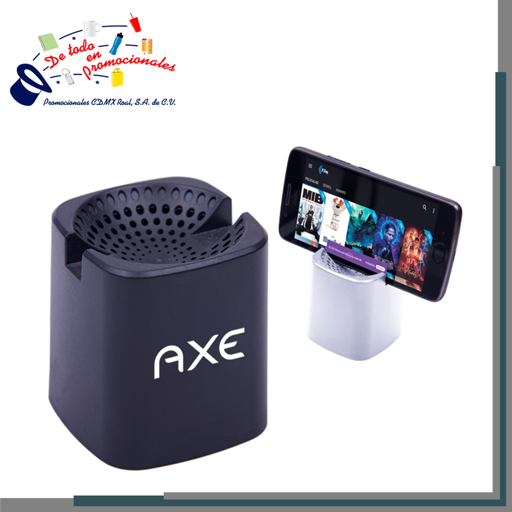 Bocina bluetooth con manos libres, ranura para colocar el teléfono en la bocina. Botón de encendido y cable de carga.