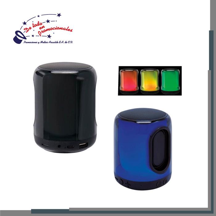 Bocina bluetooth recargable. Luz RGB con 7 efectos diferentes. Reproducción de música por 3 horas aproximadamente. Tiempo de carga 2-3 horas. Alcance de conexión de 10 metros. Batería de 500 mAh. Conexión tipo C. Incluye cable auxiliar y asa de silicón para transportarla fácilmente.