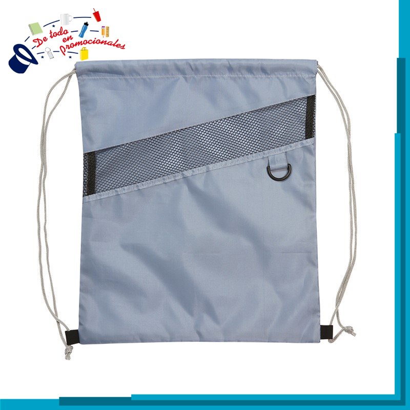 Mochila fabricada en poliéster, con dos cordones dobles que permiten el cierre de la misma y que se ajuste a la medida deseada. Tiene un diseño con tela tipo mesh que permite la ventilación dentro de la mochila. Cuenta también con un medio arillo para colgar varios objetos como llaveros, dijes y demás decoraciones.
