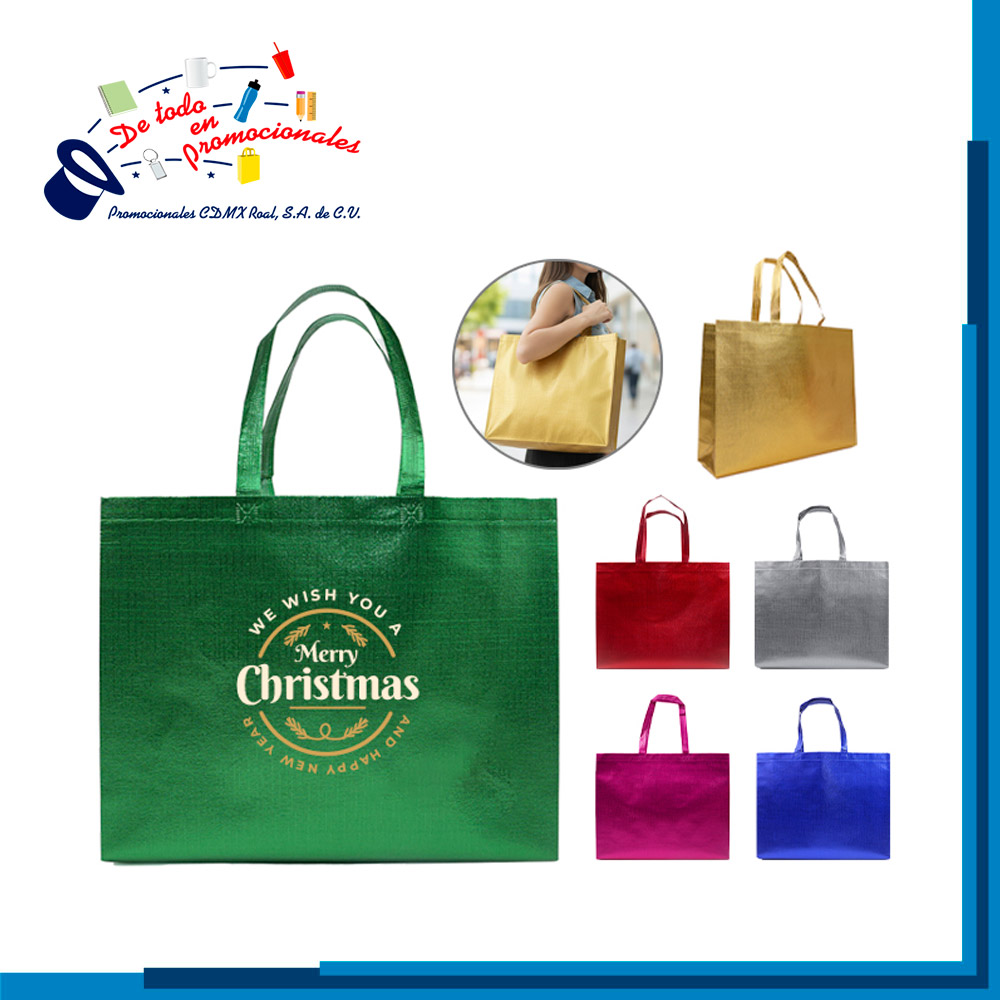 Bolsa termosellada de Non Woven metalizado de 105 g, cuenta con 2 asas. Peso máximo de carga de 11 kg.