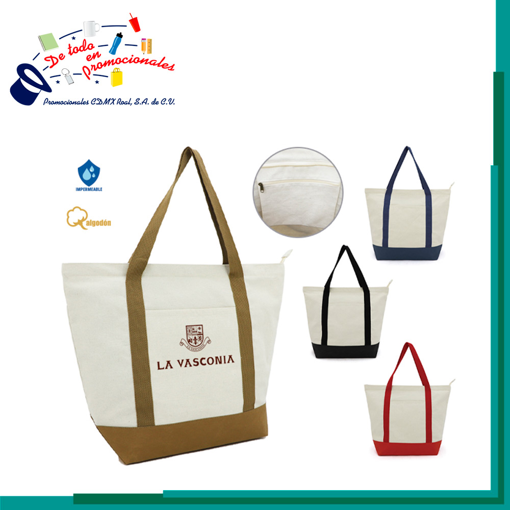 Bolsa cosida de poli algodón con base de kraft, cuenta con un compartimento principal con cierre, bolsillo interno con cierre y bolsillo frontal externo. Incluye base y 2 asas de algodón del mismo color.