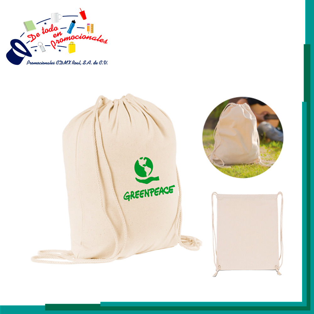 Morral 100% de algodón con jaretas y cordón. Peso máximo de carga 12 kgs.