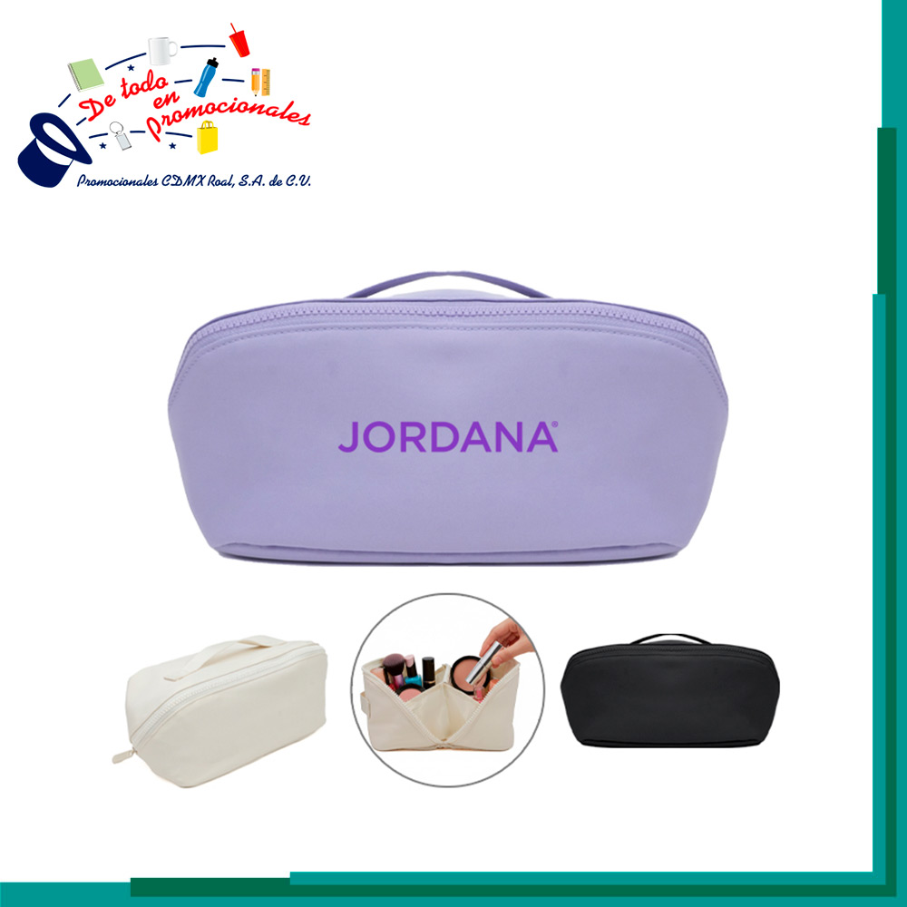 Cosmetiquera / neceser de viaje rectangular con asa y cierre cruzado, que le da mayor amplitud, permitiendo abrirlo en su totalidad. En su interior cuenta con forro, 3 bolsas laterales con resorte, 2 pequeñas de un lado y 1 del otro lado, además de un bolsillo central transparente con cierre.