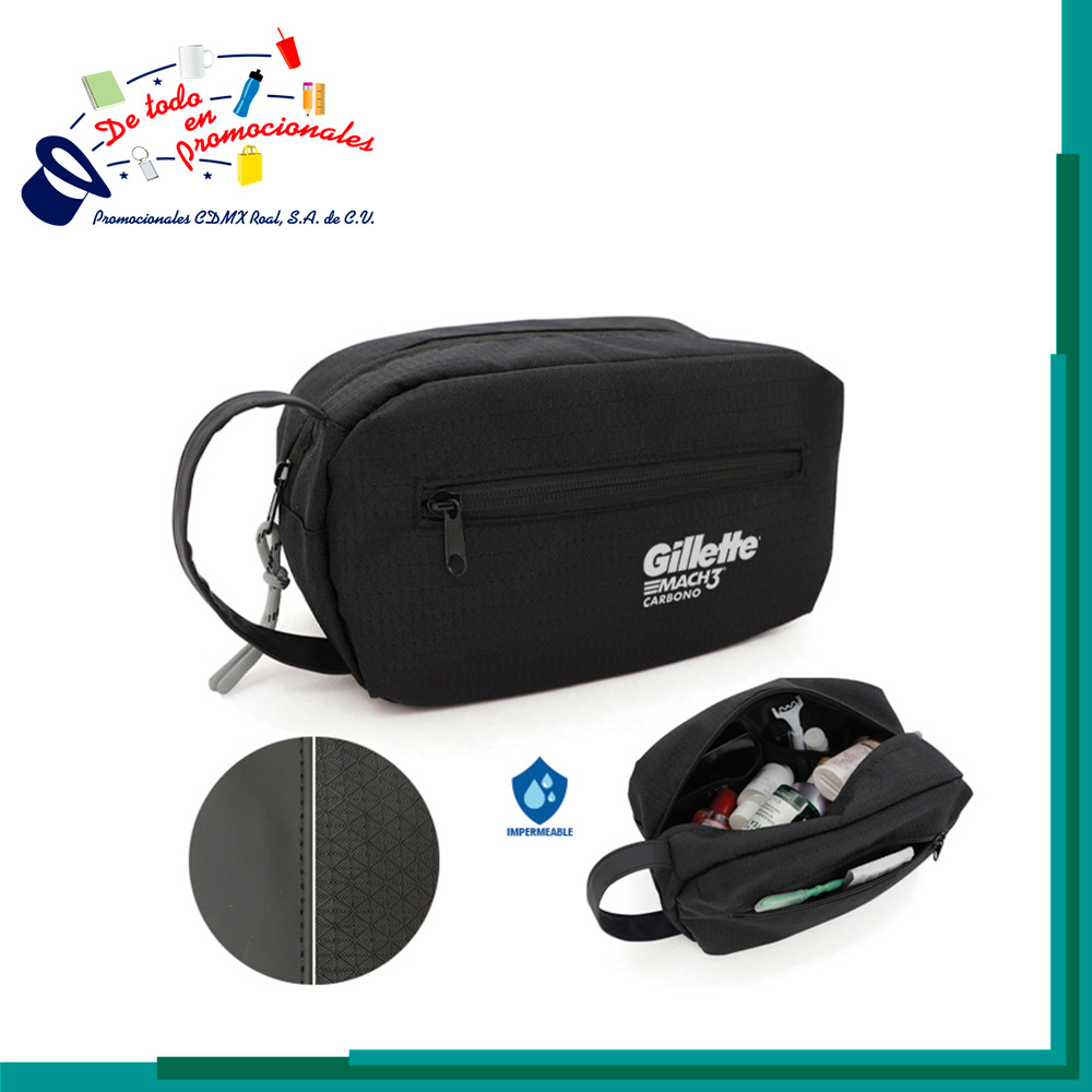 Neceser de viaje de poliéster texturizado con bolsillo exterior frontal; compartimiento principal con forro, 2 bolsillos internos de red y cierre central con tirador. Cuenta con asa exterior de curpiel para transportar.