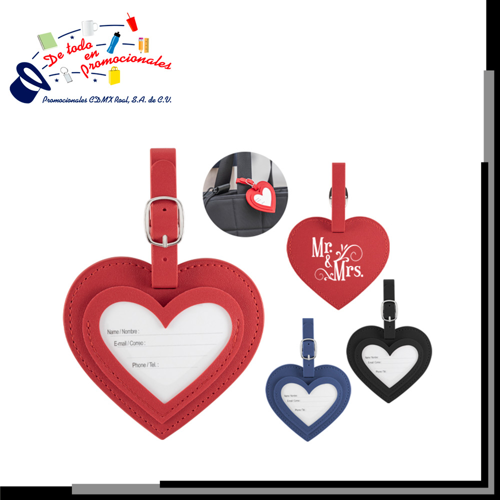 Identificador de equipaje de PU en forma de corazón. Cuenta con una pulsera ajustable para el equipaje y tarjeta para datos personales en español/inglés.